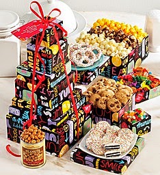 Our 6-tier Fun With Snacks design Tower contains tier after tier of deliciousness: Gourmet Rainbow Sandwich Cookies, Gourmet White Coated Rainbow Pretzels, Chocolate Chip Cookies, Sassy Taffy, Honey Roasted Peanuts, Jelly Belly® Beans and 3 flavors of gourmet popcorn: White Cheddar, Cheese and Almond Pecan corn.