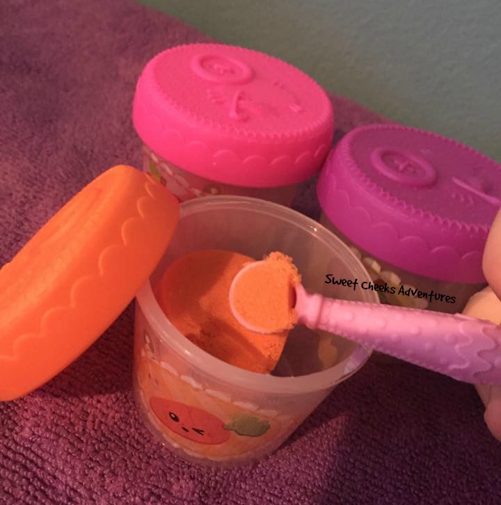 There are many different dolls on the market that are becoming more and more real. You feed the doll and it relieves itself like your daughter does. Or kind of. With the Lalaloopsy Potty Surprise, you feed the baby "food" that comes in the 3 different colors. The texture of the food is similar to a molding sand. Once it is in the mouth, you can help it down by pressing/turning the button while sitting her on her potty chair!